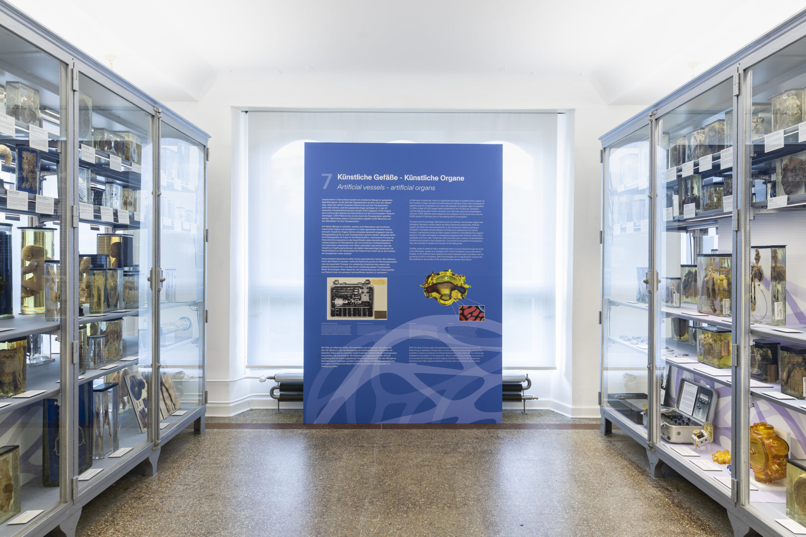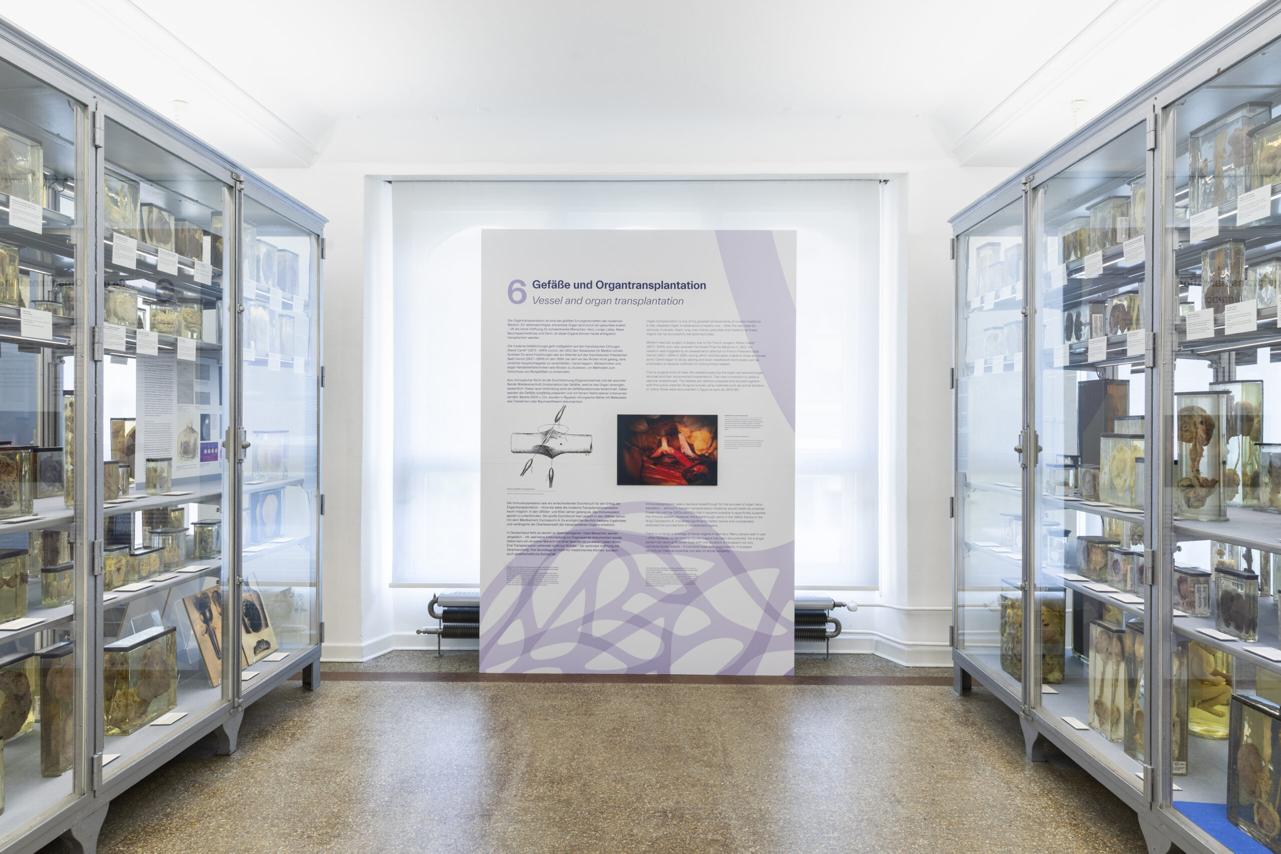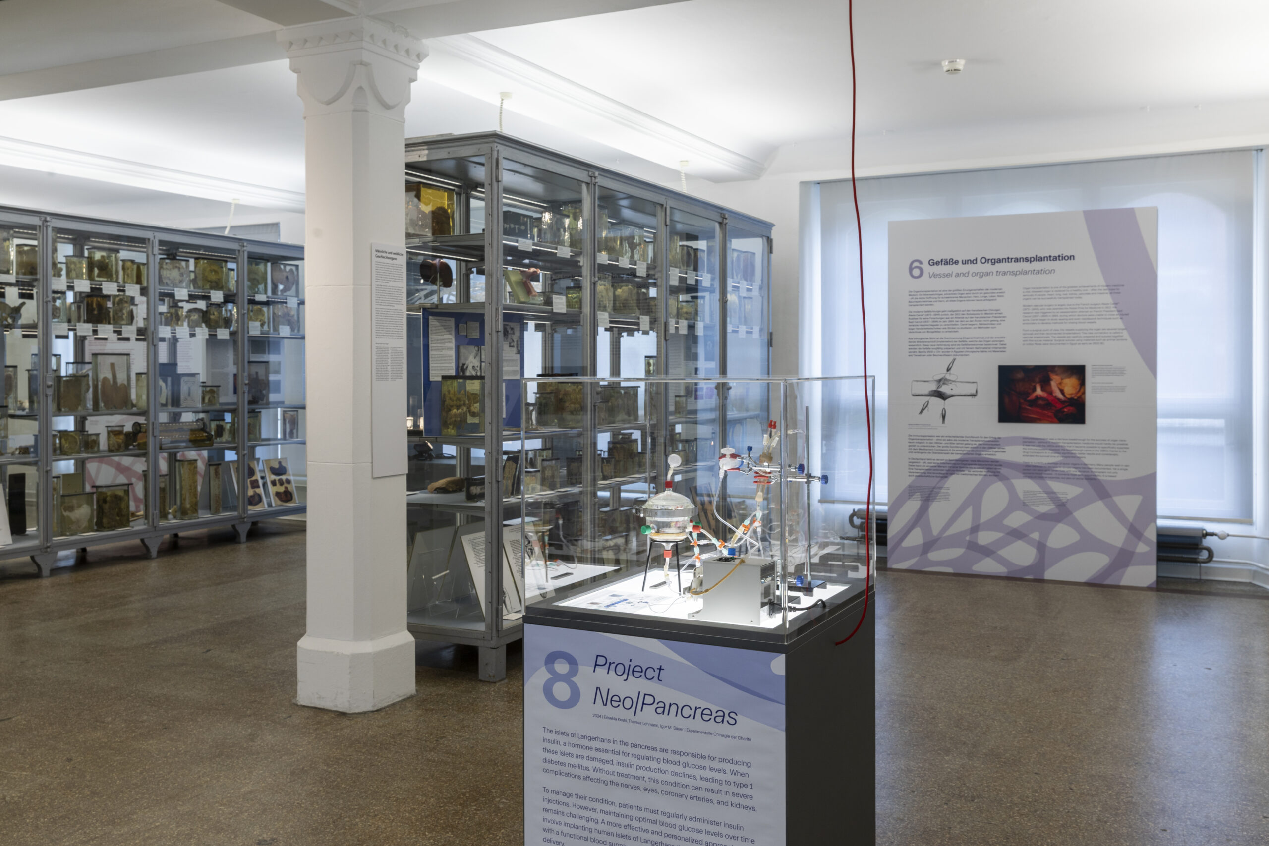 Meine Arbeit umfasste die Gestaltung von Stellwänden, Infografiken und die szenografische Einbindung von wissenschaftlichen Objekten, Skulpturen und Forschungsergebnissen. Zusätzlich war ich verantwortlich für die Konstruktion und Produktion von individuell angefertigten Vitrinen. Ziel war es, komplexe Inhalte – etwa aus der Transplantationsmedizin, Materialforschung oder regenerativen