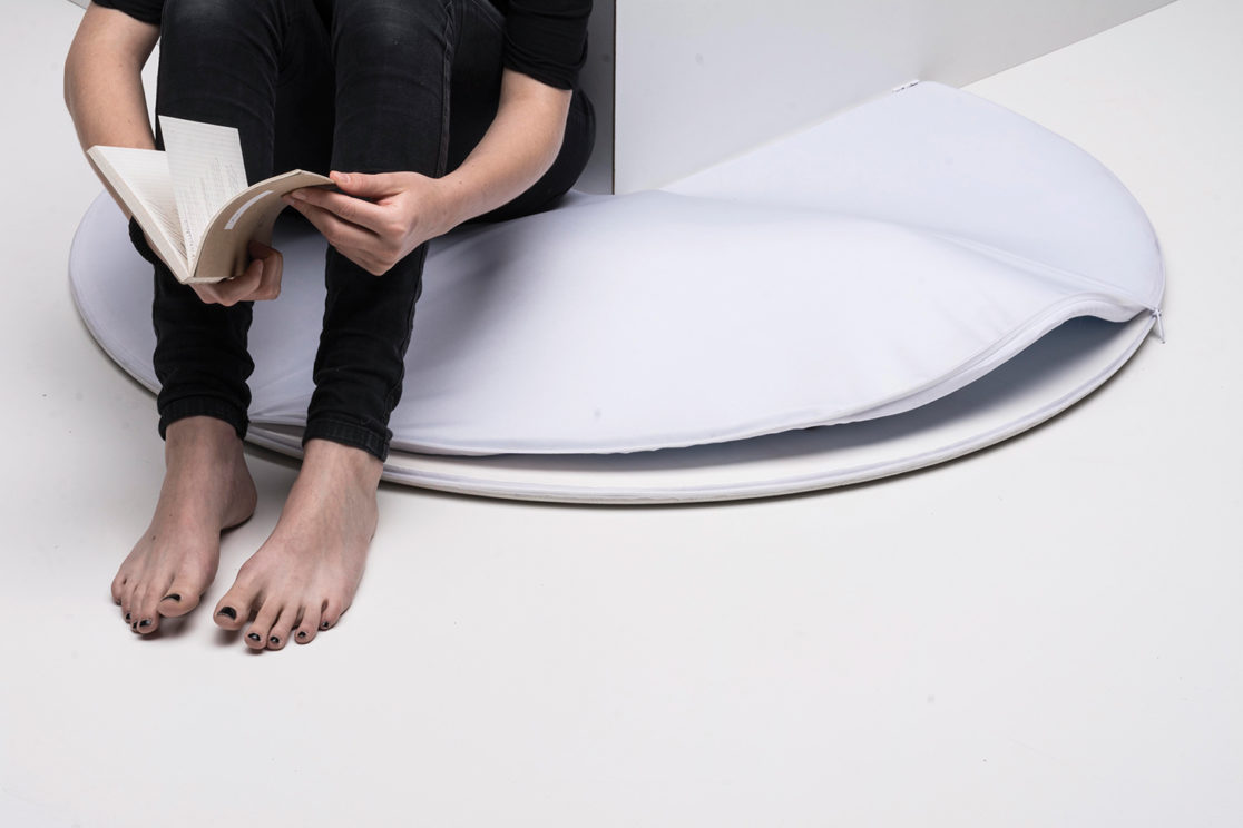 Die vier zirkulären Formen passen sich über die Ecke, Kante oder Freifläche an jeden Raum an – die kleine Variante für den Tisch, die große Variante für den Boden. Dazu wirken die Farbvarianten dezent in leichtem schwarz, oliv-grau oder klarem weiß.