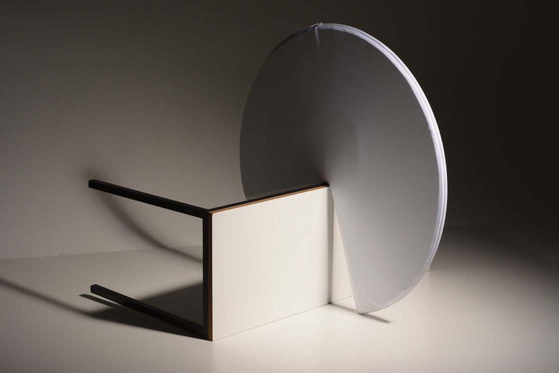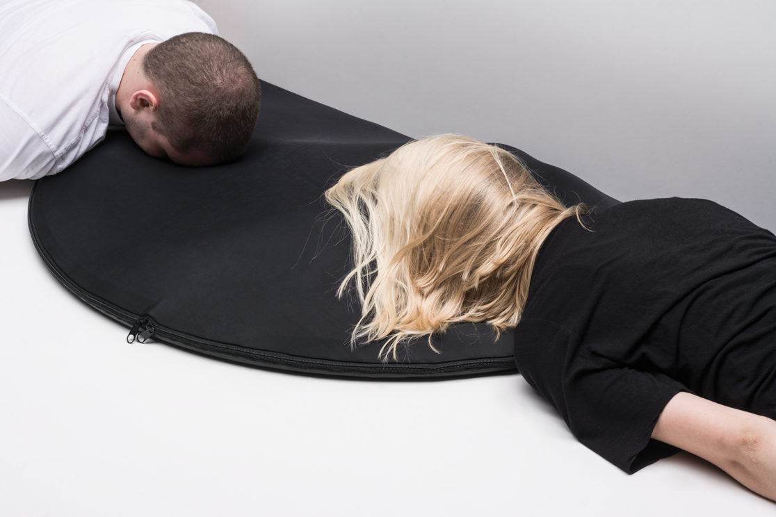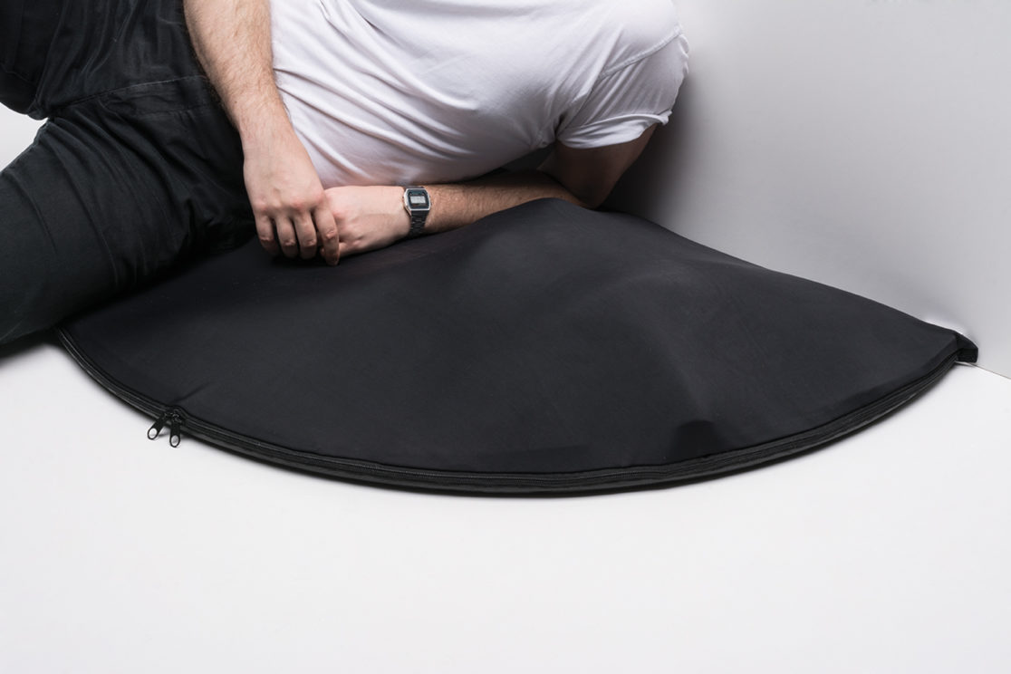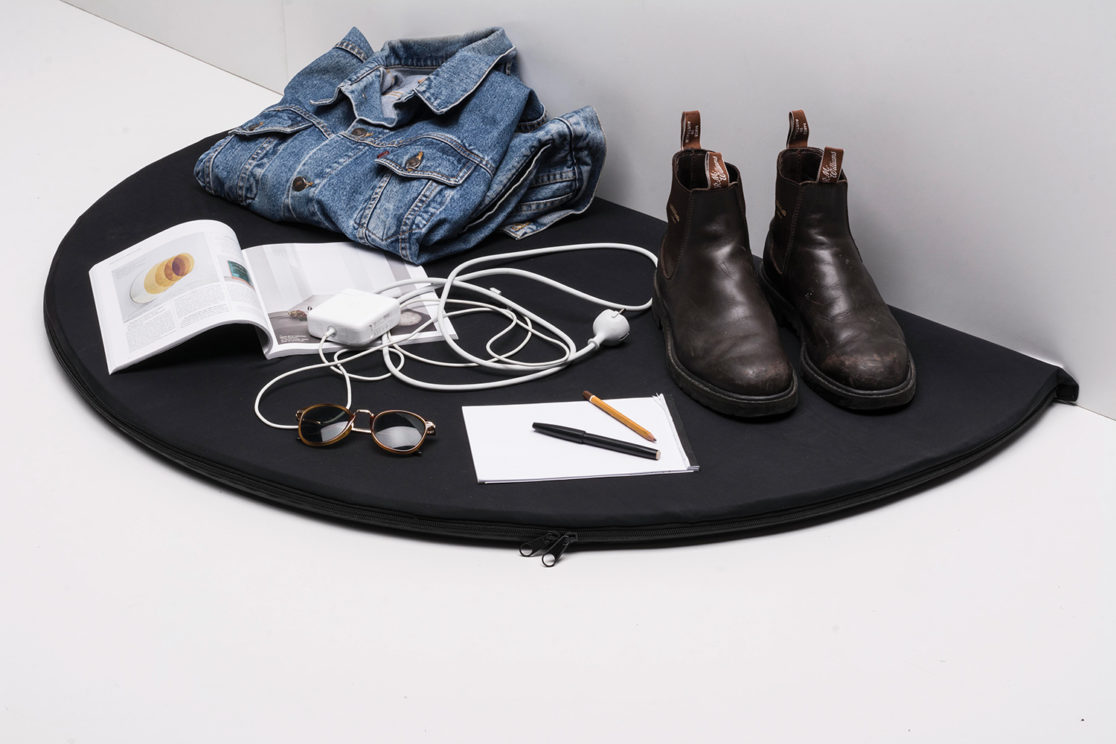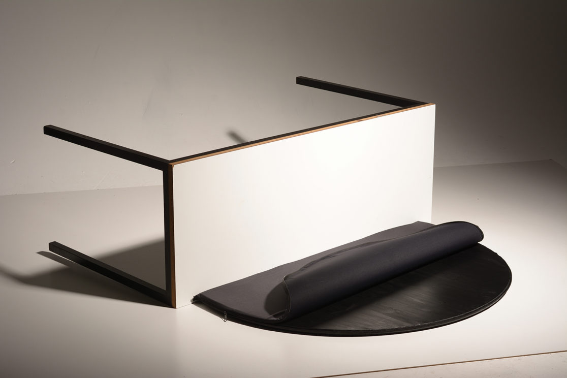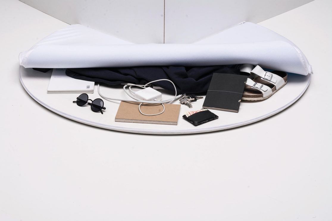 The base is made from pinewood covered in stretch fabric with a long zipper opening at the edge, allowing such objects as a mobile phone, books, ballpoint pens or cigarettes to disappear quickly and easily. This results in relief outlines of the hidden objects.