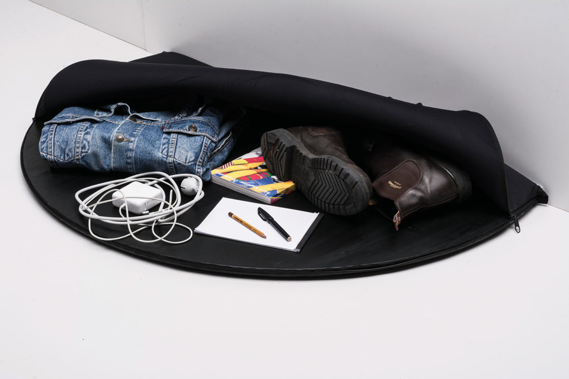 Die lasierte Kiefernplatte bildet den Untergrund für die Dinge die dich ablenken. Handy, Kugelschreiber, Zigaretten – Über den Reißverschluss verschwindet alles unter dem Stretchtextil.